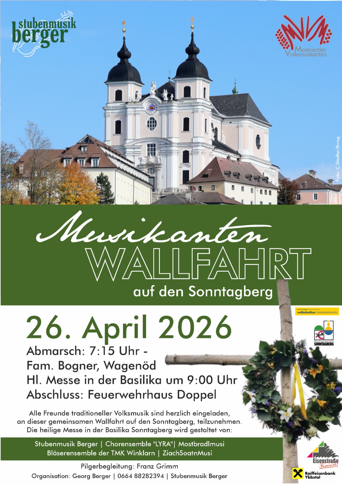 Die Mostviertler Volksmusikanten laden am Sonntag, den 26. April, zur siebzehnten Volksmusikantenwallfahrt auf den Sonntagberg. Zur Danksagung für viele Stunden gemeinsamen Singens und Musizierens wollen sie nach einer kurzen Fußwallfahrt in der Basilika Sonntagberg innehalten und gemeinsam die heilige Messe musikalisch umrahmen.